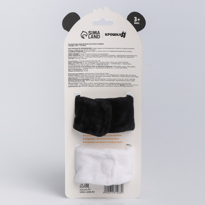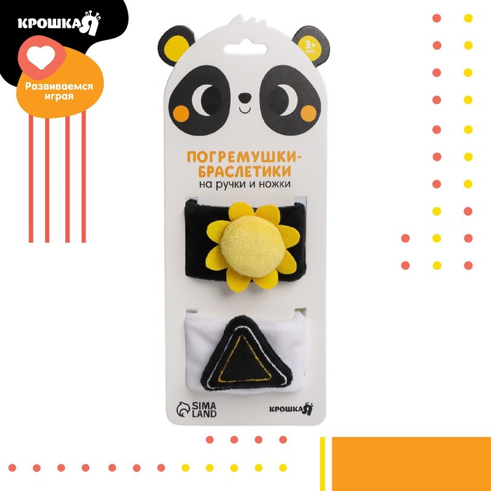Развивающая игрушка выполнена в виде браслетика на липучке. В комплект входят две штуки. Их можно надеть малышу на ручки или ножки. Звуковые элементы будут греметь, когда непоседа сменит положение тела.