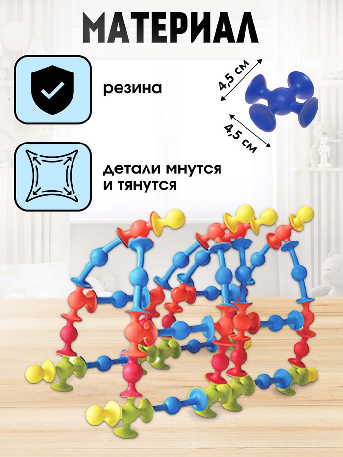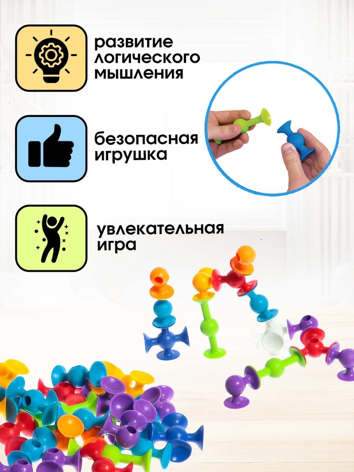 Детский конструктор с присосками — это увлекательная игрушка для развития воображения и моторики. Гибкие элементы легко соединяются между собой, позволяя ребёнку создавать фигуры, постройки и необычные конструкции. Яркие детали привлекают внимание, а мягкий материал делает игру безопасной.