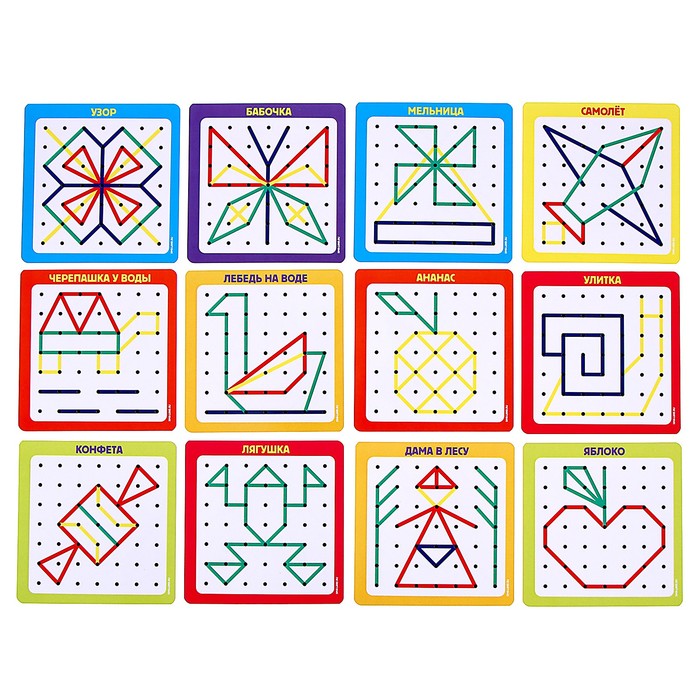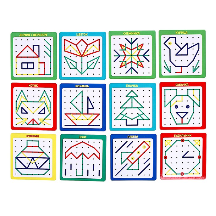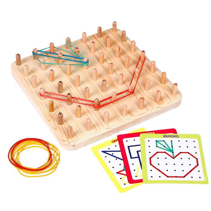 Геоборд — это специальная доска для конструирования различных изображений с помощью равноудалённых друг от друга штырьков и резиночек. Их малышу предстоит нанизывать на выпуклые элементы и создавать таким образом разнообразные фигуры.