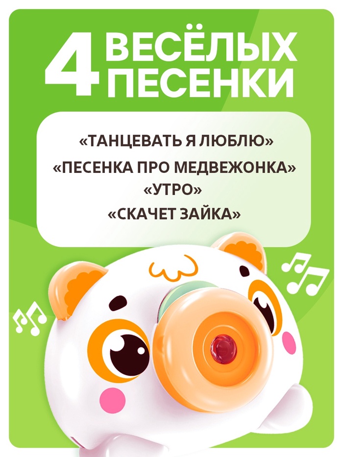 - Изделие воспроизводит 4 песенки: «Танцевать я люблю», «Песенка про медвежонка», «Утро», «Скачет зайка».