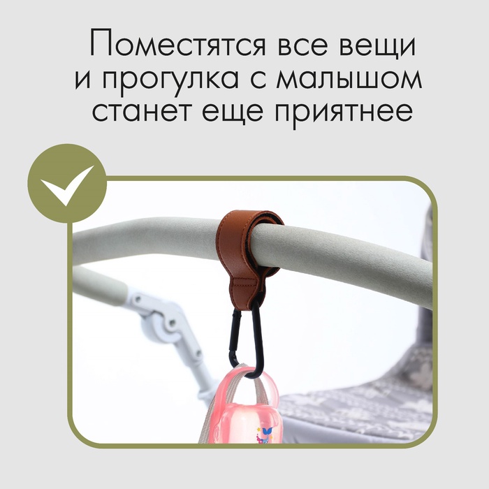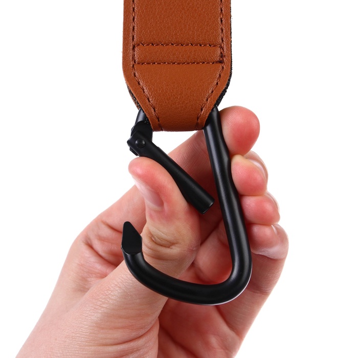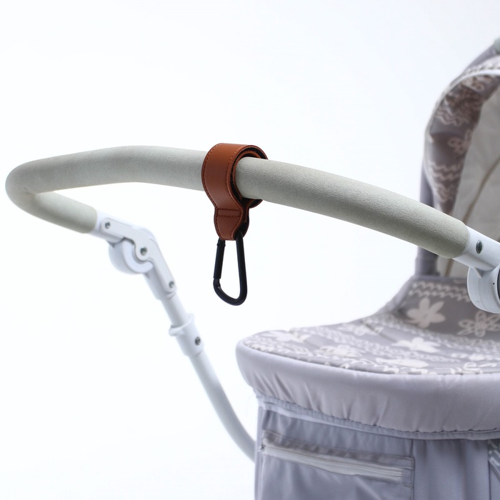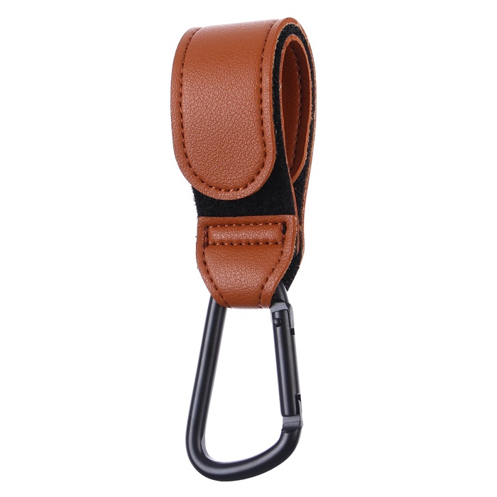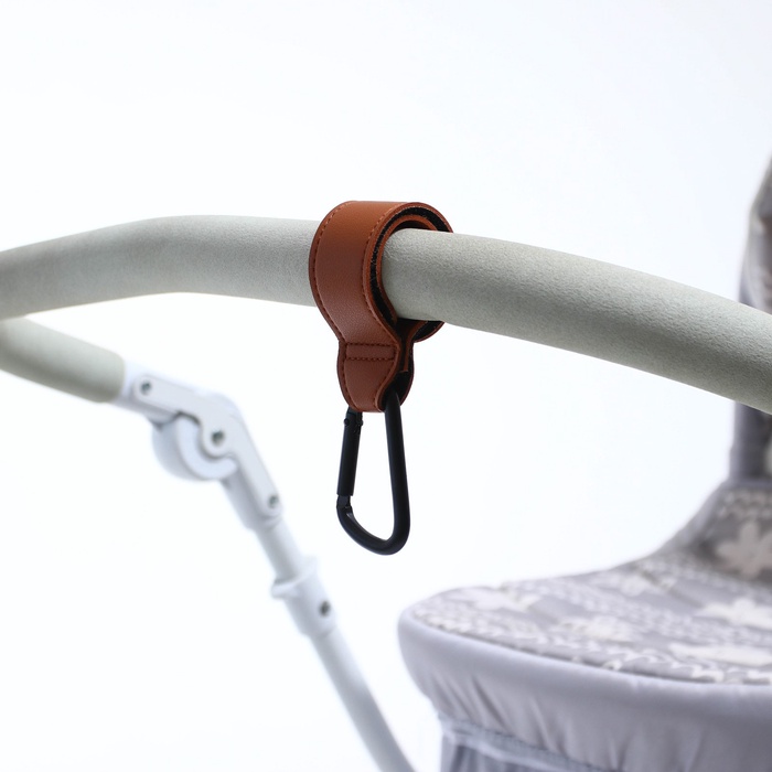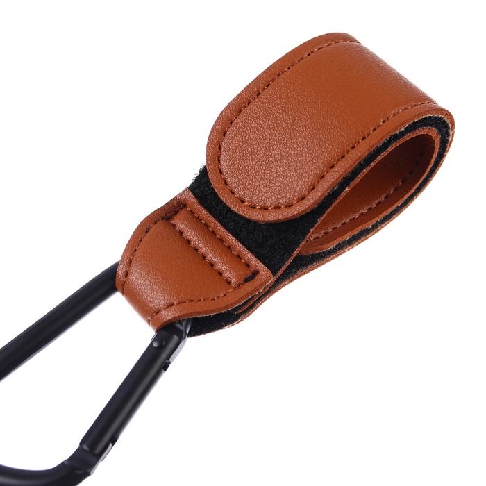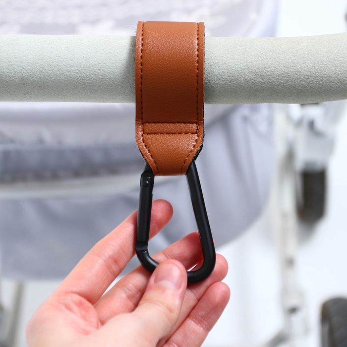 Крючок карабин для сумок на коляску, на липучке, экокожа, коричневый