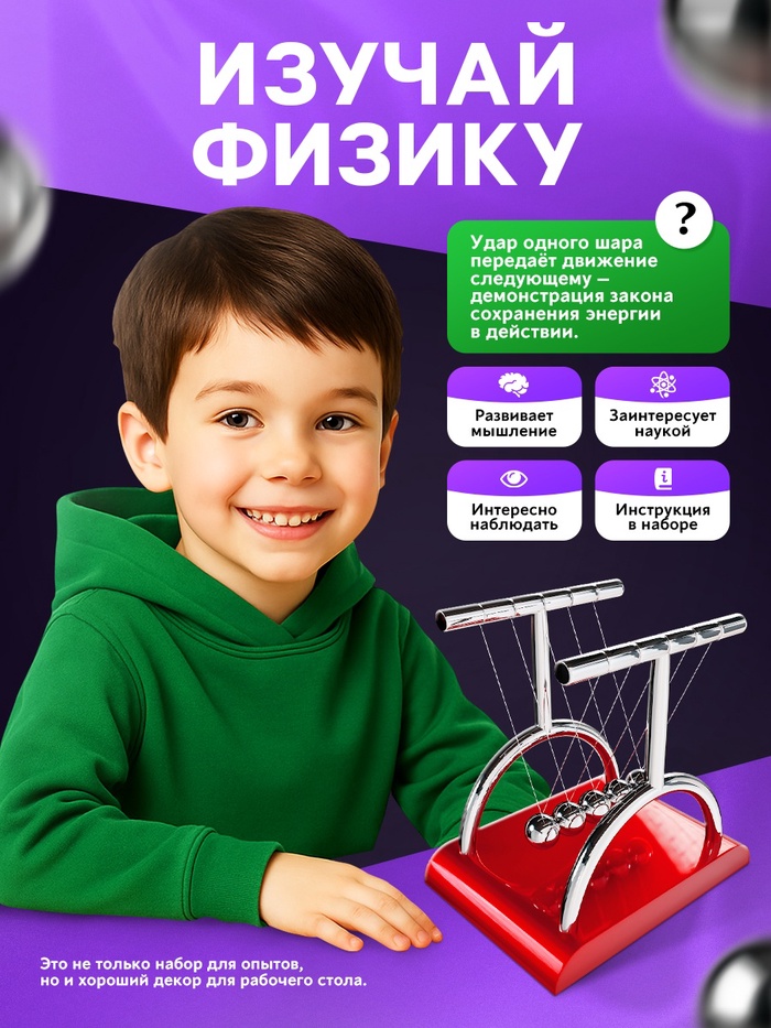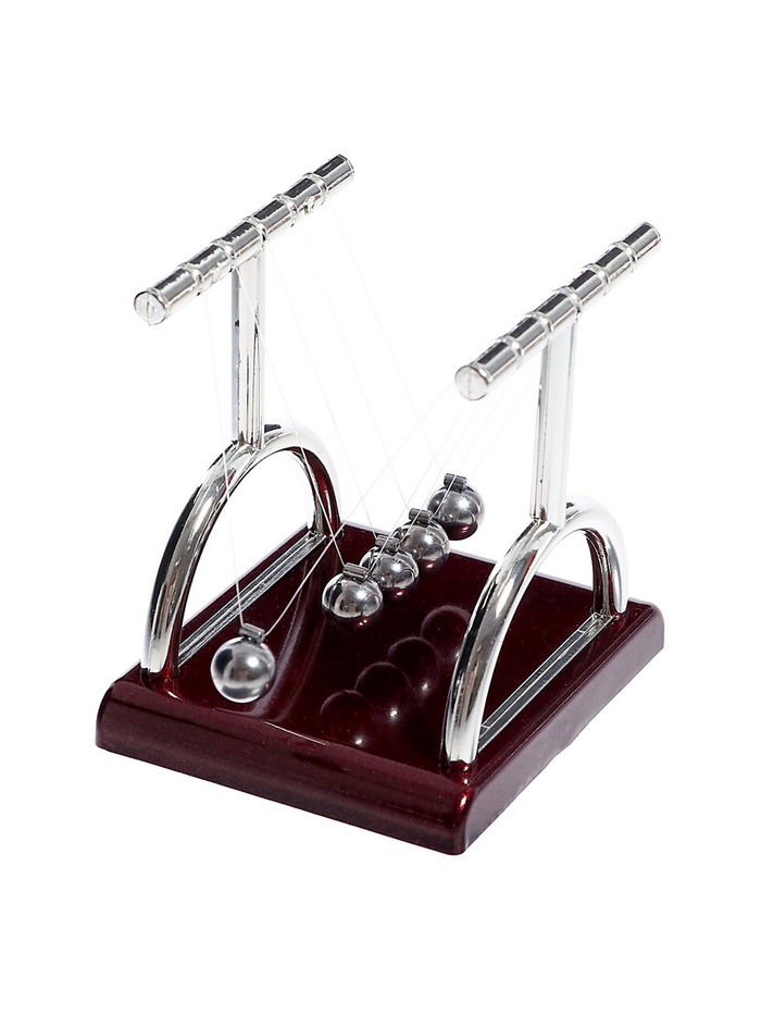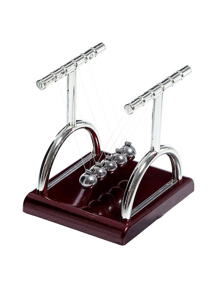 - Маятник — колыбель Ньютона, который открыл законы движения и гравитации. Когда маятник начинает качаться, дети смогут наблюдать, как он передает импульс от одного шарика к другому. Это происходит потому, что энергия и сила не пропадают, а переходят от одного шарика к другому.