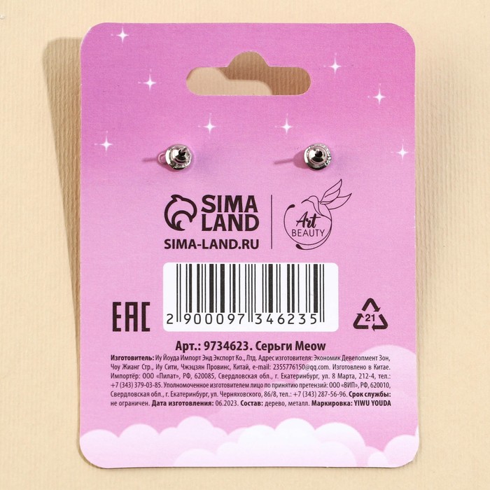 Серьги детские Meow, гвоздики