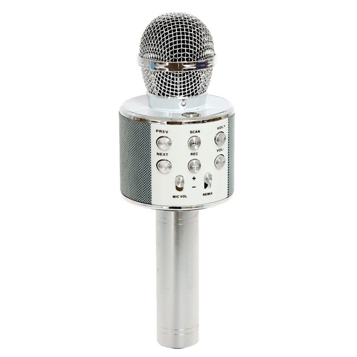 - Микрофон со встроенной колонкой поддерживает воспроизведение аудиозаписей с карты памяти Micro-SD, оснащён функциями записи, регулировки звука, кнопками переключения аудиодорожек.