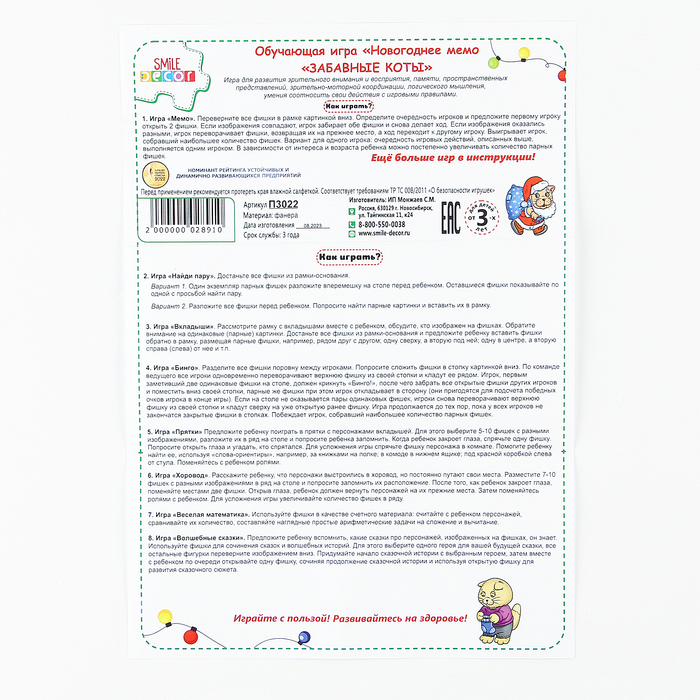 Игра подойдёт в качестве новогоднего сюрприза или семейного развлечения на праздники. Компактные размеры позволяют взять её с собой в гости или на отдых. Удивляйте близких и создавайте тёплые воспоминания с игрой «Новогоднее мемо»!