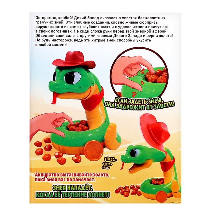 «Золото кобры» — настольная игра для детей от 3 лет. Малыш столкнётся с грациозным и опасным животным. Ребёнку предстоит проявить свою ловкость и не попасться хищнику. Будьте осторожны. Змея чувствует ваше приближение и может напасть в любой момент.