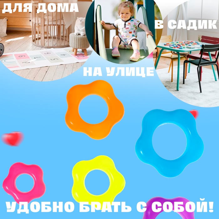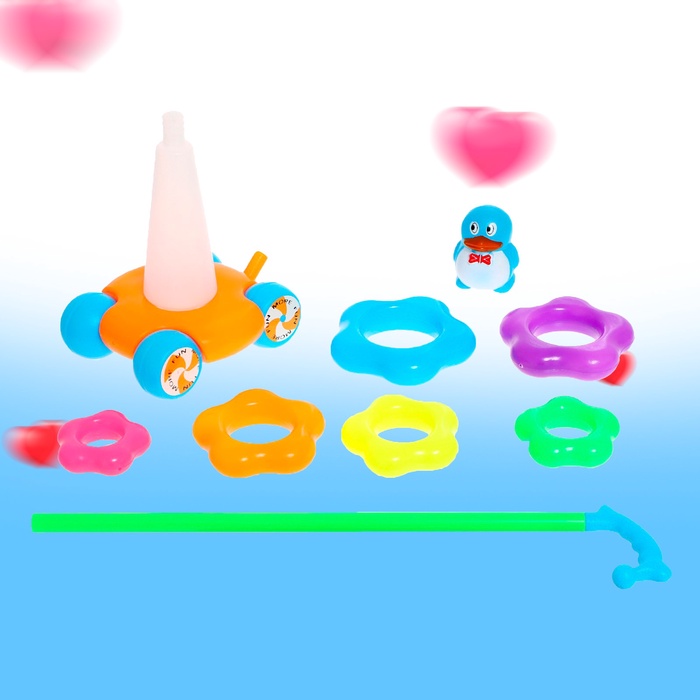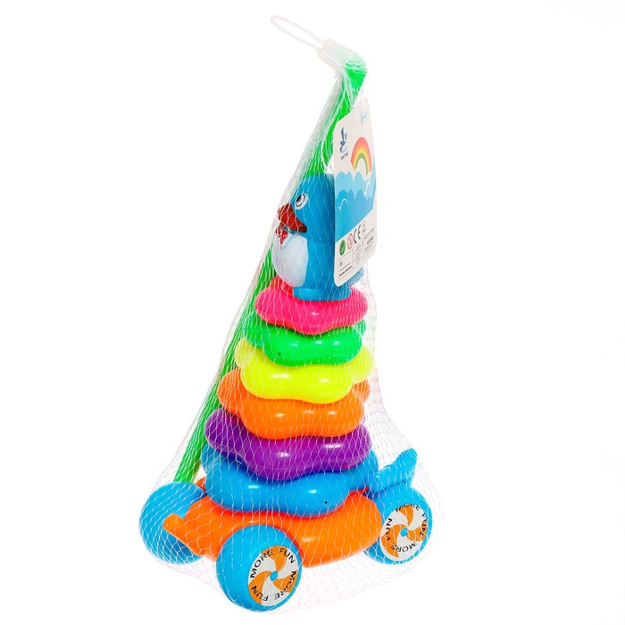 - В комплекте шесть разноцветных колец, которые ребёнок может складывать, развивая мелкую моторику.