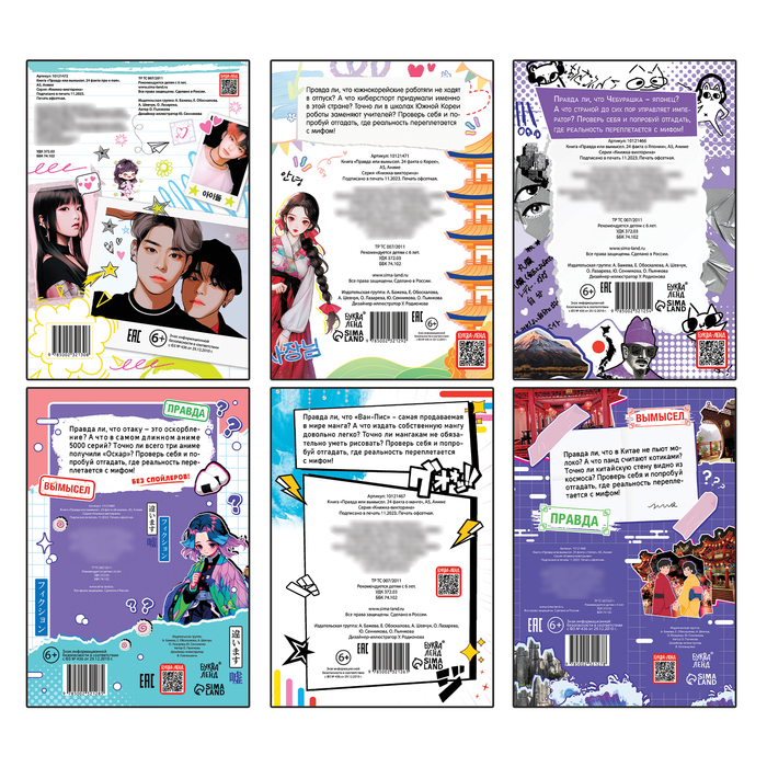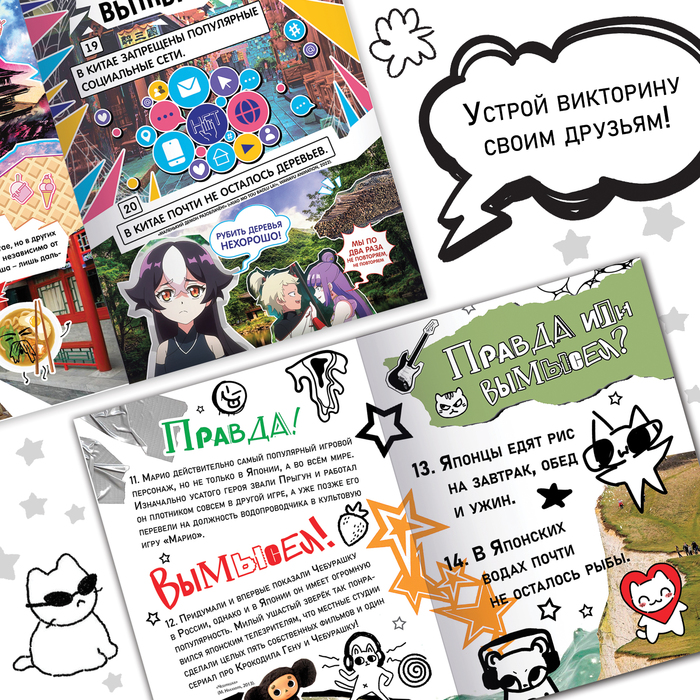 - Внутри каждой книги по 20 вопросов и 4 дополнительных факта на различные тематики: о странах (Япония, Корея, Китай) и книжки для отаку (аниме, манга, К-поп).