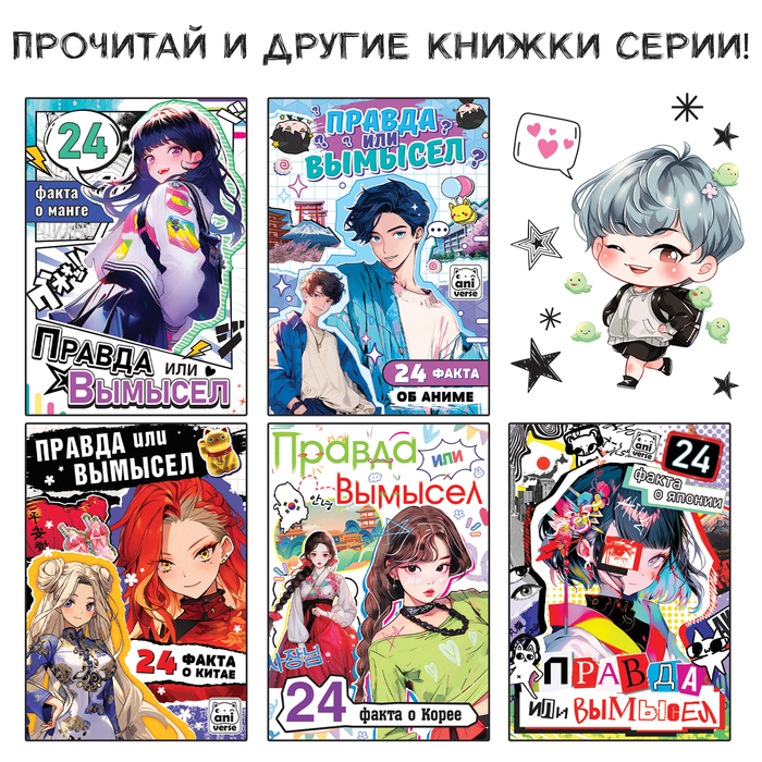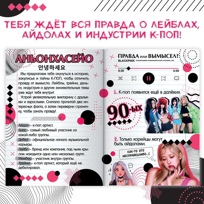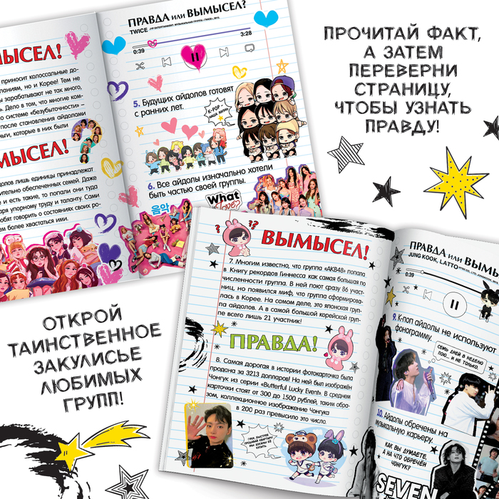 Книга «Правда или вымысел» позволит вам окунуться в культуру K-pop индустрии. Внутри вы найдёте 20 вопросов и фактов об индустрии кейпоп, о самых популярных группах и айдолах. С данной книгой вы сможете не только расширить свой кругозор, но и весело провести время с друзьями, просто устройте увлекательную викторину: задавайте вопрос и собирайте голоса за каждый вариант.