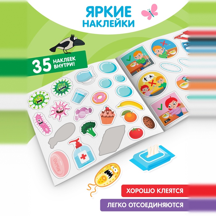 Ребёнок изучает группы продуктов через игру: распределяет наклейки, выполняет задания, запоминает простые правила. Книга помогает сформировать правильные пищевые привычки с раннего возраста.