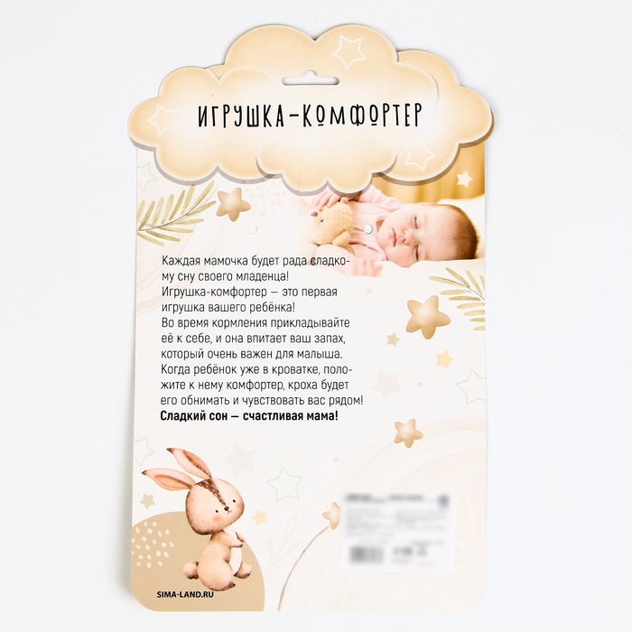 Игрушку можно ненадолго оставить рядом с мамой, чтобы она сохранила знакомый запах. Это помогает создать привычную и спокойную атмосферу для сна в кроватке, коляске или в дороге.