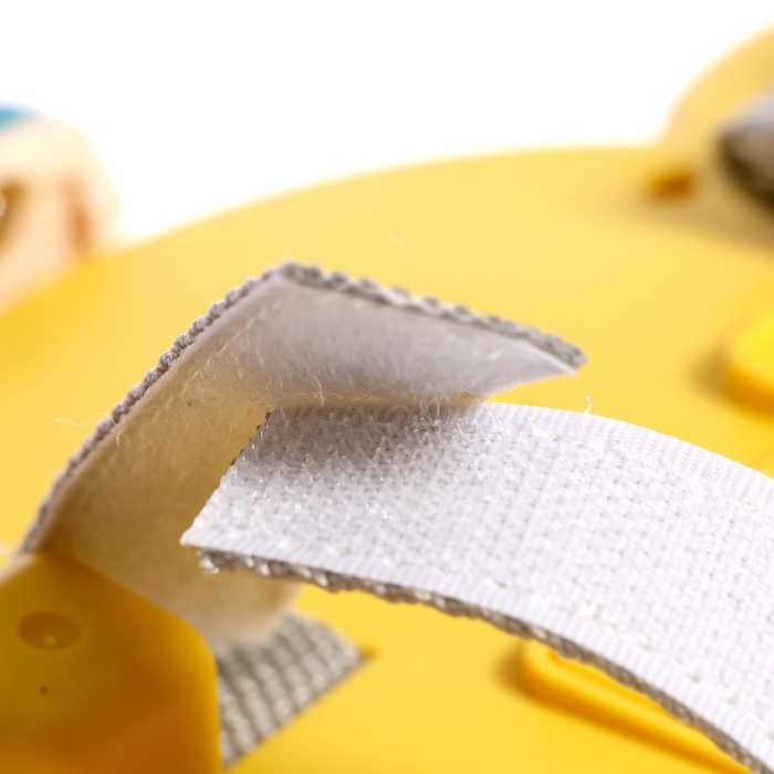 - Лёгкий пластиковый корпус без острых углов подходит для детей с рождения. Руль крепится на коляску или кроватку с помощью липкой ленты.