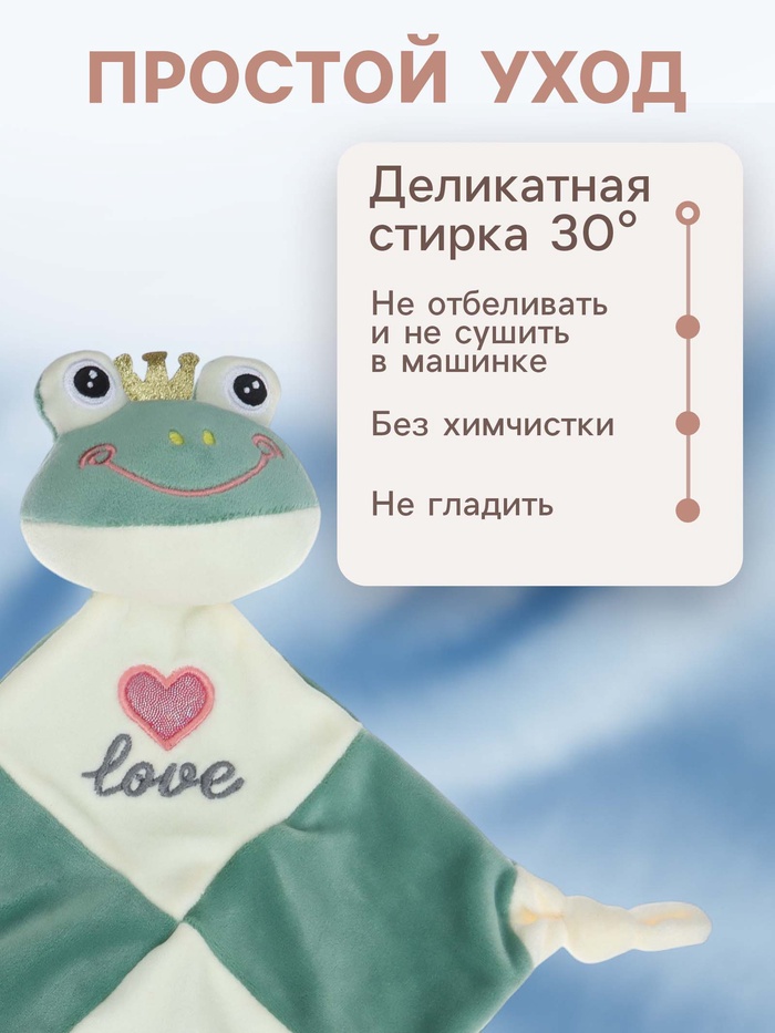 Комфортер — игрушка для сна новорождённых «Лягушастик» — мягкая плюшевая игрушка с добрым сказочным образом, созданная для спокойного засыпания и ощущения уюта рядом с малышом. Улыбчивая лягушка с короной, аккуратной вышивкой и гармоничной зелёно-молочной цветовой гаммой вызывает чувство тепла, безопасности и заботы.