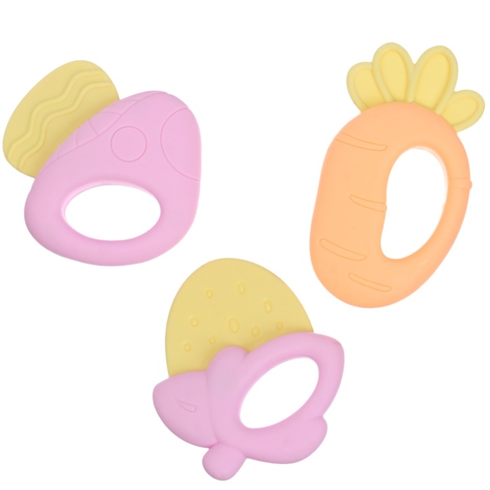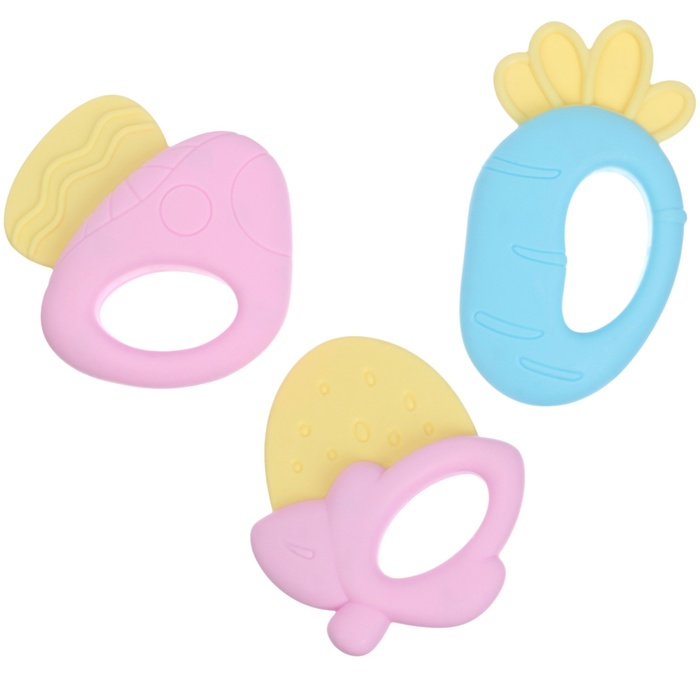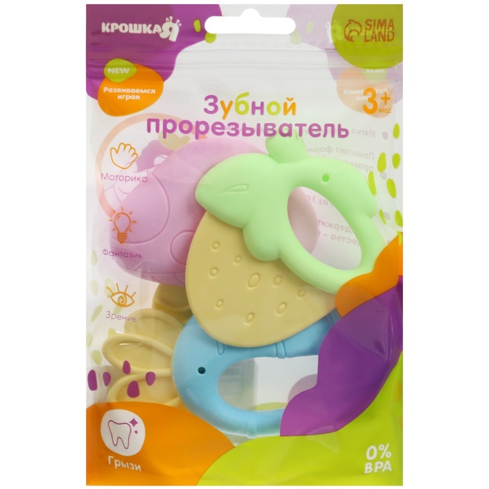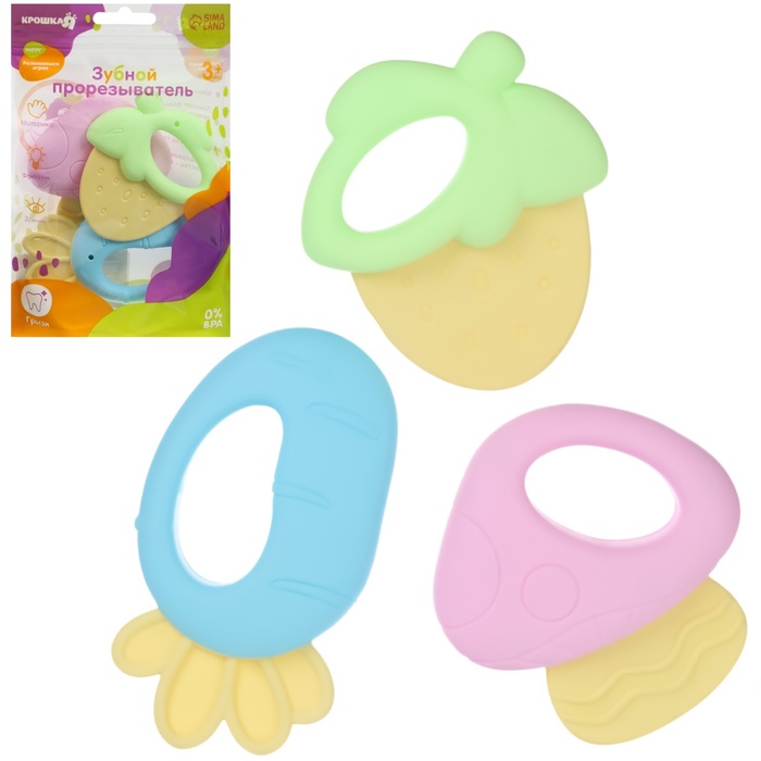 Прорезыватель снимает неприятные ощущения у малыша в период появления первых зубов. Также изделие подготовит ребёнка к процессу жевания, поспособствует формированию правильного прикуса и развитию мелкой моторики рук.Погремушка в наборе способствует развитию воображения, познанию мира звуков, цветов и визуальному восприятию.
