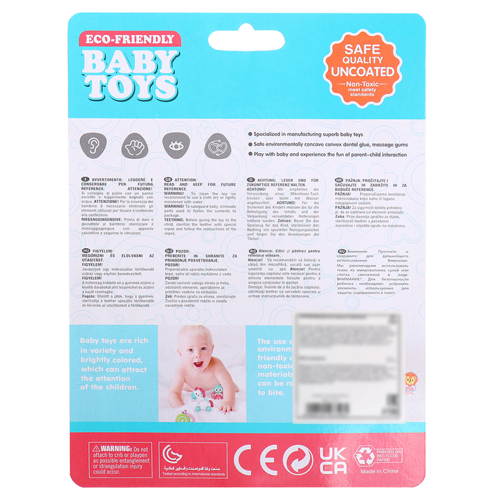 - Игрушка изготовлена из безопасных материалов — пищевого силикона и пластика. Она будет мягко массировать дёсны и облегчит боль при прорезывании зубов.