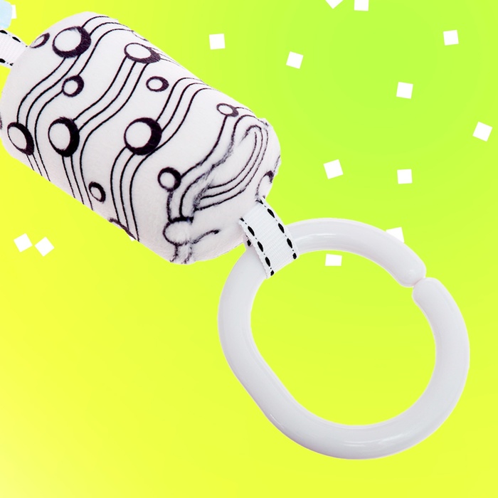 Подвеска помогает развивать слуховое и зрительное восприятие ребёнка. Игрушка легко крепится к любой поверхности, что делает её универсальным решением для дома и прогулок.