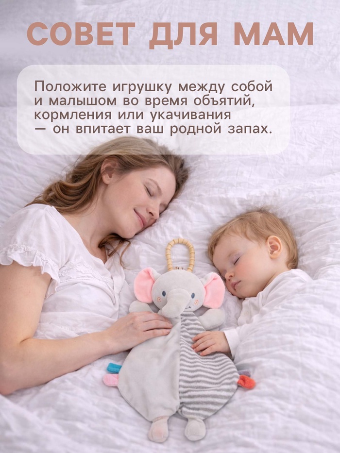 Комфортер можно закрепить рядом с малышом, чтобы он всегда оставался в поле зрения и был доступен для прикосновений. Игрушку удобно ненадолго оставить рядом с мамой — знакомый запах помогает создать ощущение спокойствия в привычной обстановке.