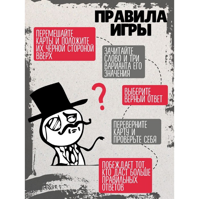 Игрок зачитывает слово и три возможных толкования — только одно из них верное. Угадал определение? Карта твоя! Ошибся — карта уходит в сброс. Побеждает тот, кто соберет больше всего карточек к концу колоды.
