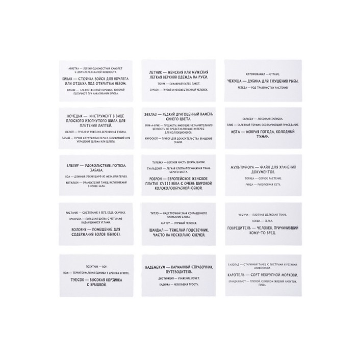 Игрок зачитывает слово и три возможных толкования — только одно из них верное. Угадал определение? Карта твоя! Ошибся — карта уходит в сброс. Побеждает тот, кто соберет больше всего карточек к концу колоды.