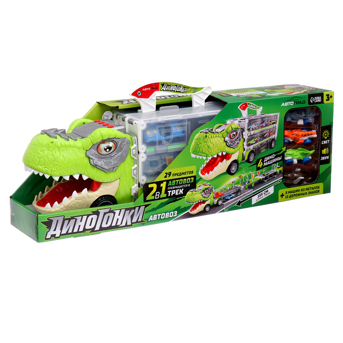Автовоз-трек «Диногонки» — это уникальный игровой набор, который включает в себя 12 металлических машинок и транспортный трек, превращающийся в захватывающую гоночную трассу. Автовоз оснащён световыми и звуковыми эффектами, добавляющими ещё больше реалистичности и веселья в игру. Набор станет идеальным подарком для юных любителей автомобилей и активных игр.