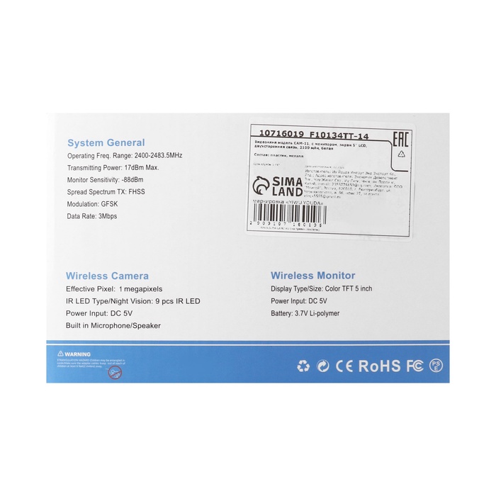 Видеоняня беспроводная с монитором, экран 5" LCD, двухсторонняя связь, 2100 мАч, белая