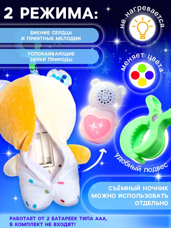 Мягкий плюшевый мишка станет верным спутником малыша в мире снов. Эта игрушка сочетает в себе нежные объятия и успокаивающие звуки, помогая ребёнку расслабиться и быстрее уснуть.