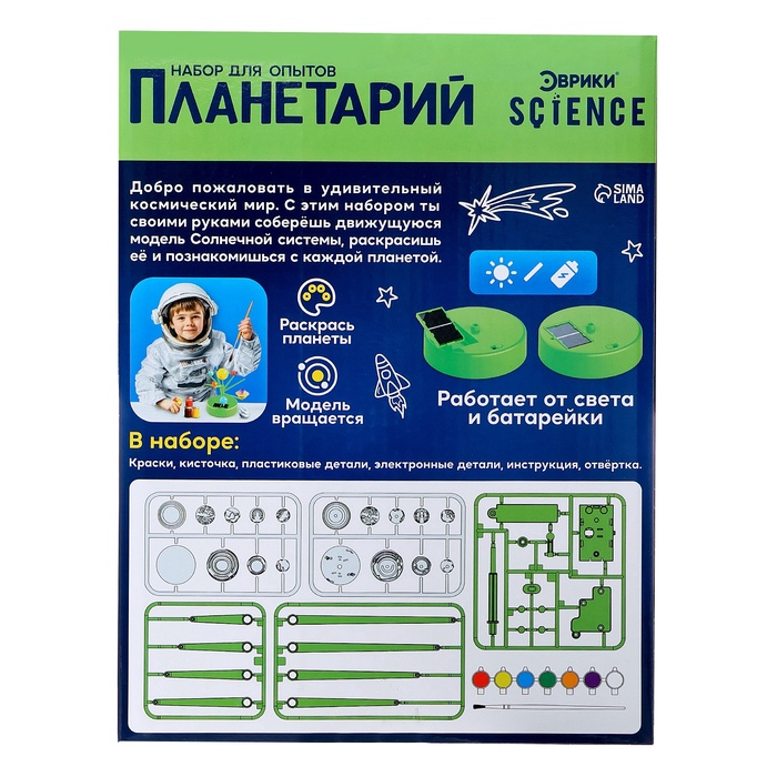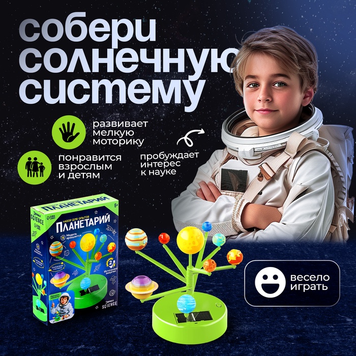 Набор для опытов «Планетарий» отправит юного исследователя в далёкое космическое путешествие! Ребёнок сам соберёт модель Солнечной системы, запомнит расположение планет и раскрасит каждое небесное тело.
