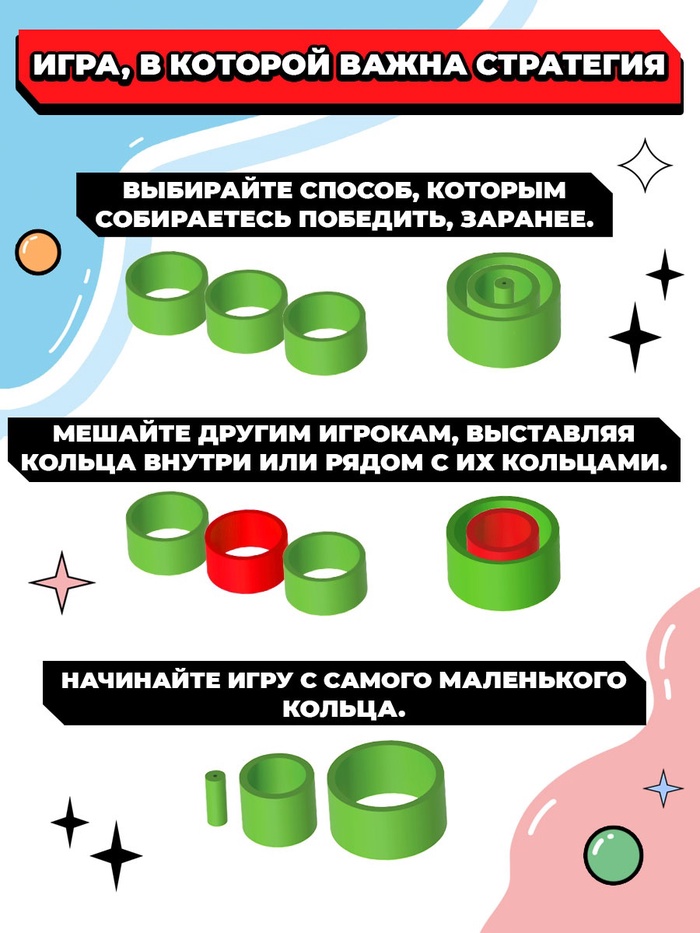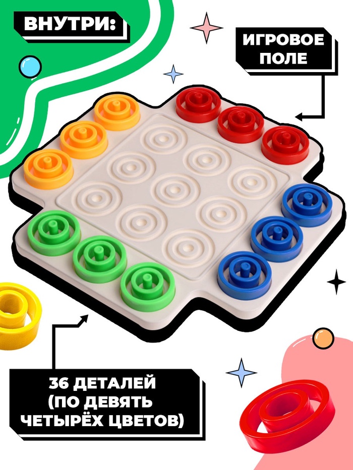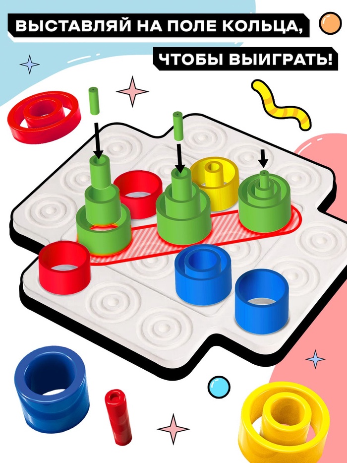 «Логикруг» — настольная игра для детей от 5 лет. Захватывающая настолка с яркими элементами предназначена для веселой тренировки на логику и увлекательного времяпровождения. Задача ребёнка — составить три фигуры своего цвета по горизонтали, вертикали или диагонали или заполнить одну ячейку только своими кольцами.