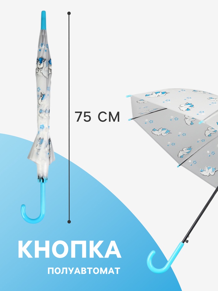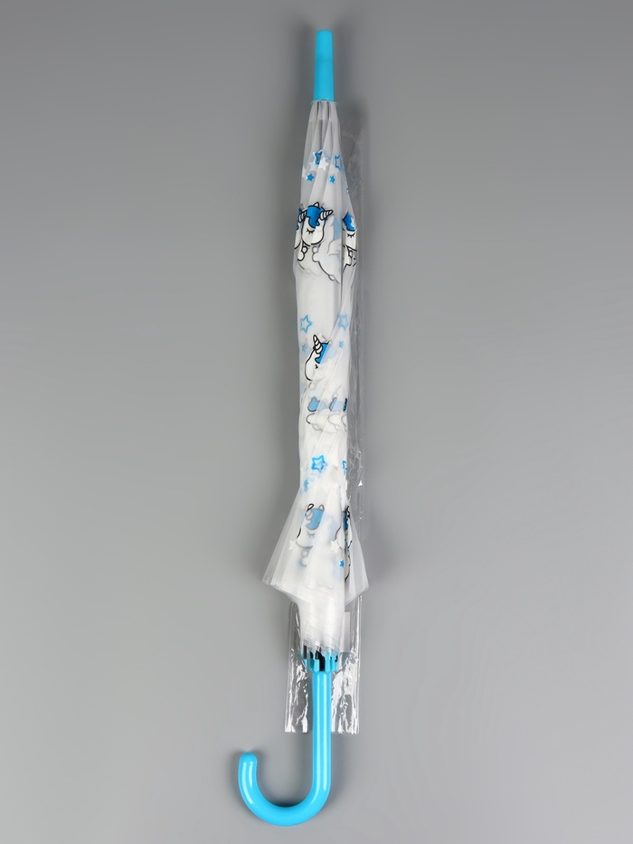 Зонт - трость детский «Единороги», полуавтоматический, 8 спиц, R=45/54 см, d=90 см, прозрачный, белый, голубой