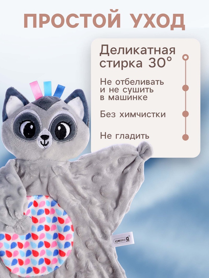 Мягкая игрушка-комфортер «Енотик» станет идеальным выбором для самых маленьких. Эта текстильная игрушка выполнена в виде милого енота и создана специально для малышей с рождения. Её мягкость и уют помогают успокоить ребёнка и создать чувство безопасности.