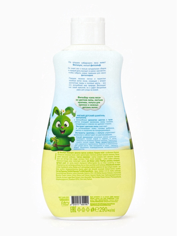 Мягкий детский шампунь Фитопупс с волшебным ароматом цветов и трав мягко очищает волосики, кожу головы младенцев и совсем не щиплет глазки. Мягкая формула средства содержит всю пользу натуральных экстрактов лесных трав, которые дарят малышу нежный уход с самого рождения.