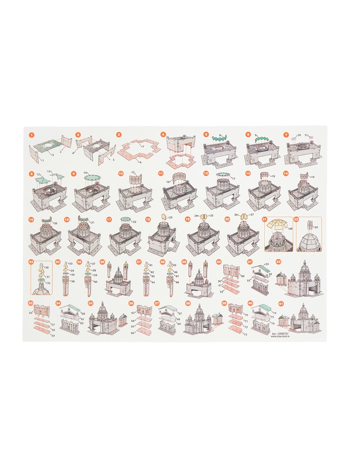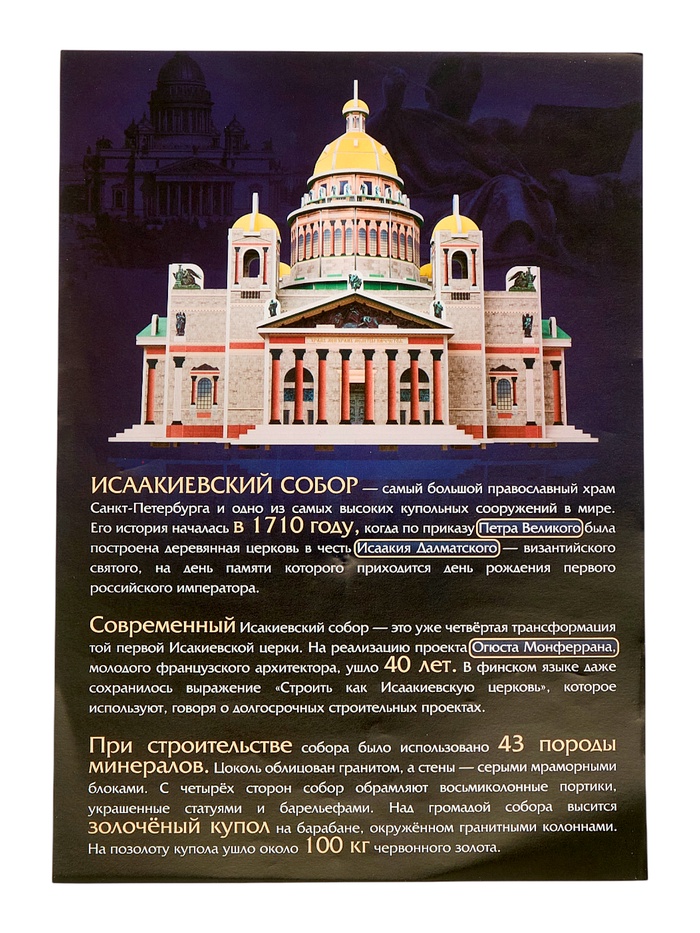- Историческая справка: на обороте инструкции размещена информация об Исаакиевском соборе. Сборка модели превращается в увлекательный урок истории и архитектуры.