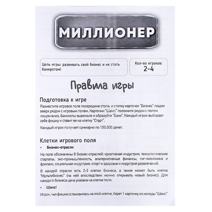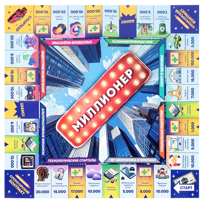 Почувствуй вкус больших решений и честной конкуренции. Экономическая настольная игра «Миллионер» — классическая семейная стратегия, где каждый ход влияет на капитал, репутацию и положение на игровом поле. Игра объединяет азарт, расчёт и живое общение за одним столом.