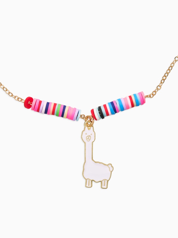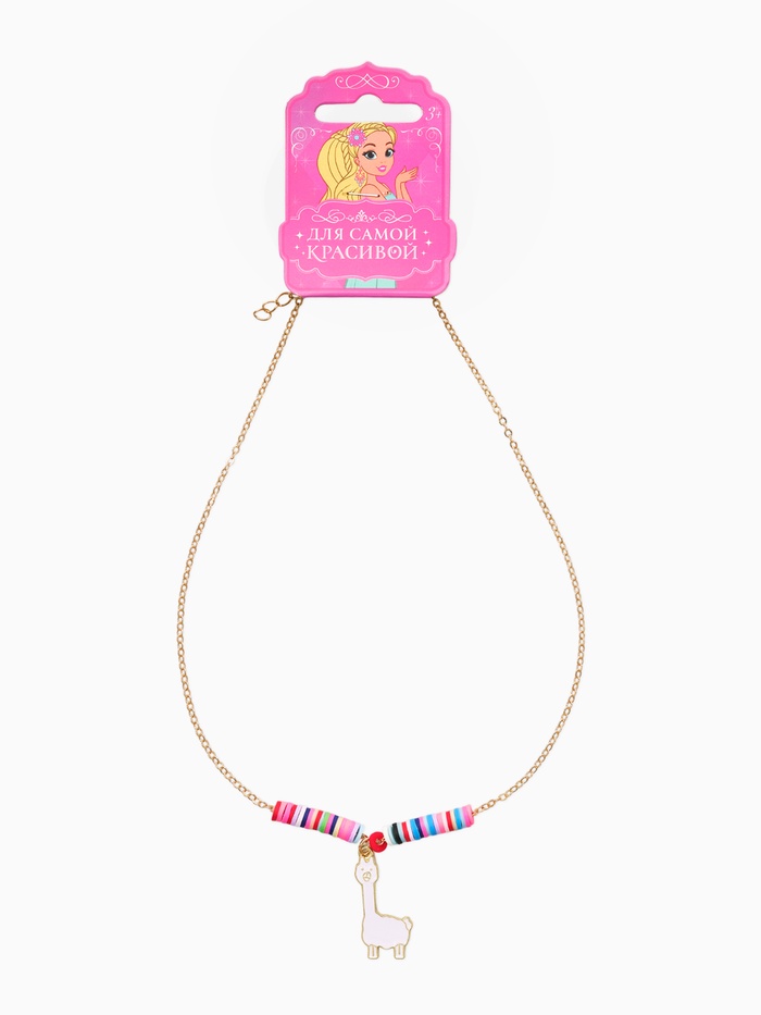 Этот яркий аксессуар создан, чтобы раскрасить каждый день юной модницы сочными красками. Насыщенная палитра разноцветного бисера в сочетании с золотистой фурнитурой создает праздничное настроение, а центральным элементом образа выступает очаровательная белоснежная подвеска в виде альпаки, которая эффектно выделяется на пестром фоне.