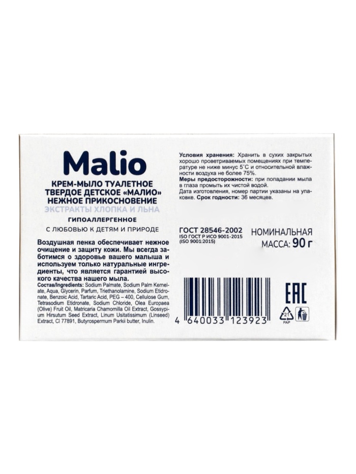 Компактная упаковка весом 90 г обеспечивает удобство использования дома и в поездках, а экономичный расход делает средство практичным для ежедневного применения. Крем-мыло туалетное «Малио» экстракт хлопка и льна — это безопасная, мягкая и эффективная забота о коже ребёнка, увлажнение, питание и комфорт при каждом умывании.