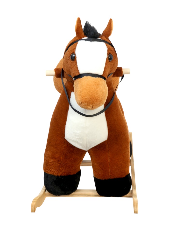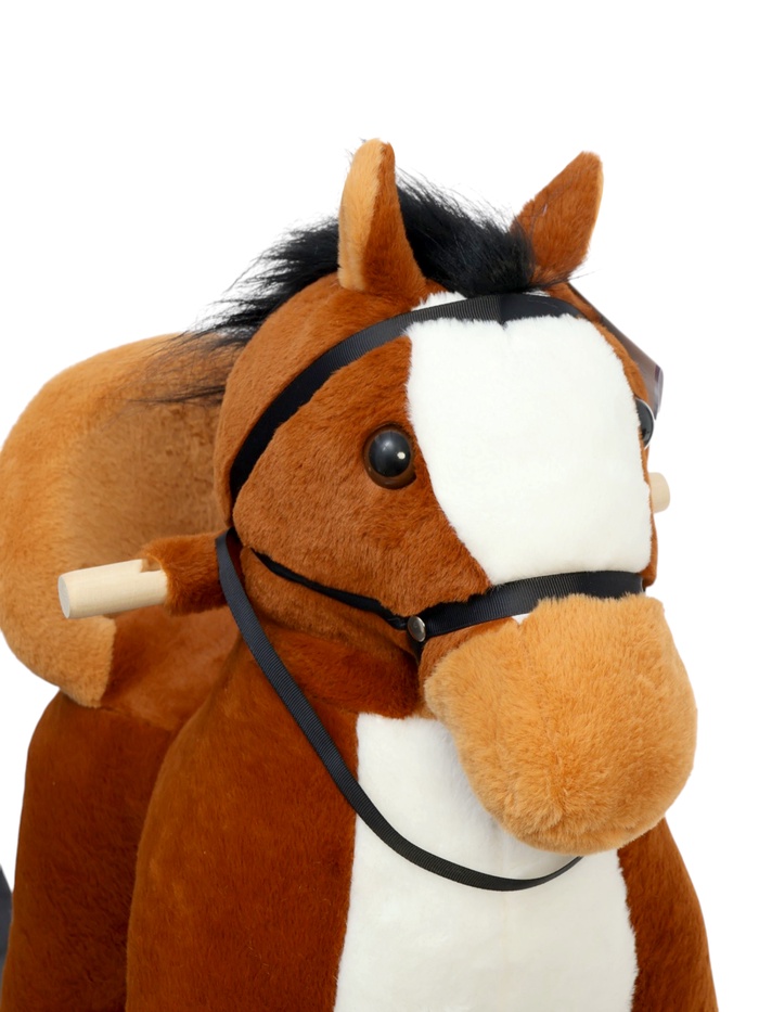 Игрушка выполнена в виде красивой лошадки с мягким корпусом, гривой, хвостом и удобными ручками. Спинка делает посадку более комфортной и помогает ребёнку чувствовать себя увереннее во время катания. Деревянные полозья обеспечивают устойчивое и плавное качание.
