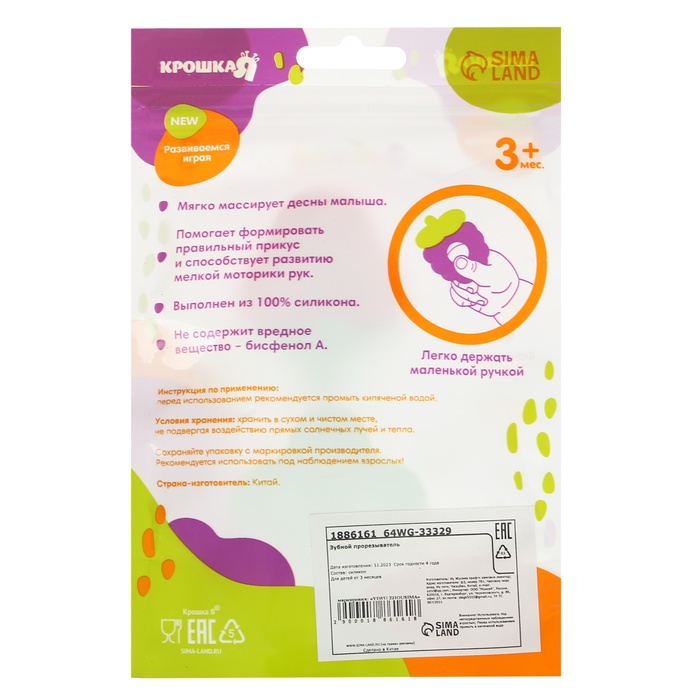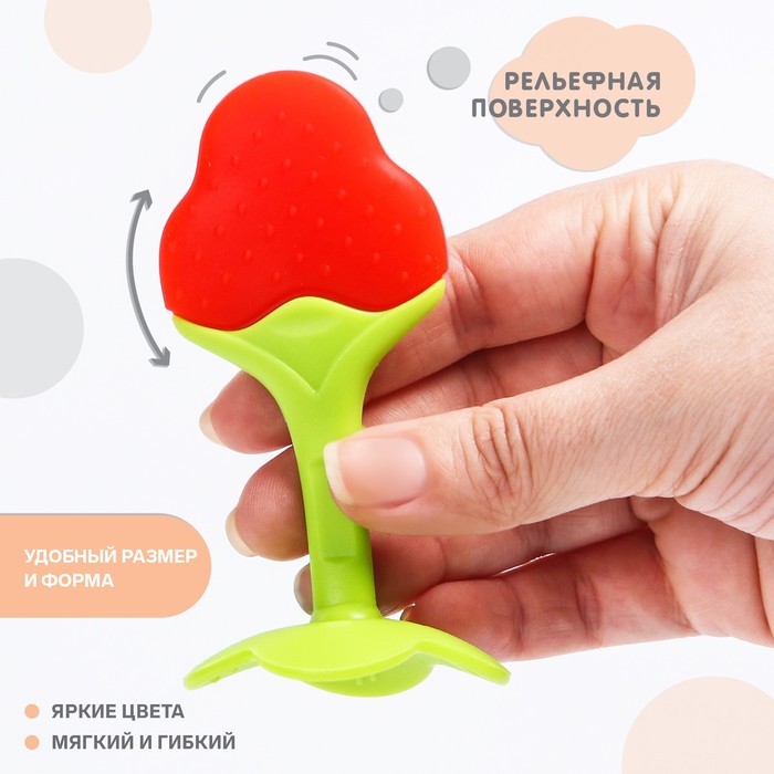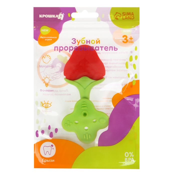 Прорезыватель снимает неприятные ощущения у малыша в период появления первых зубов. Также изделие подготовит ребёнка к процессу жевания, поспособствует формированию правильного прикуса и развитию мелкой моторики рук.