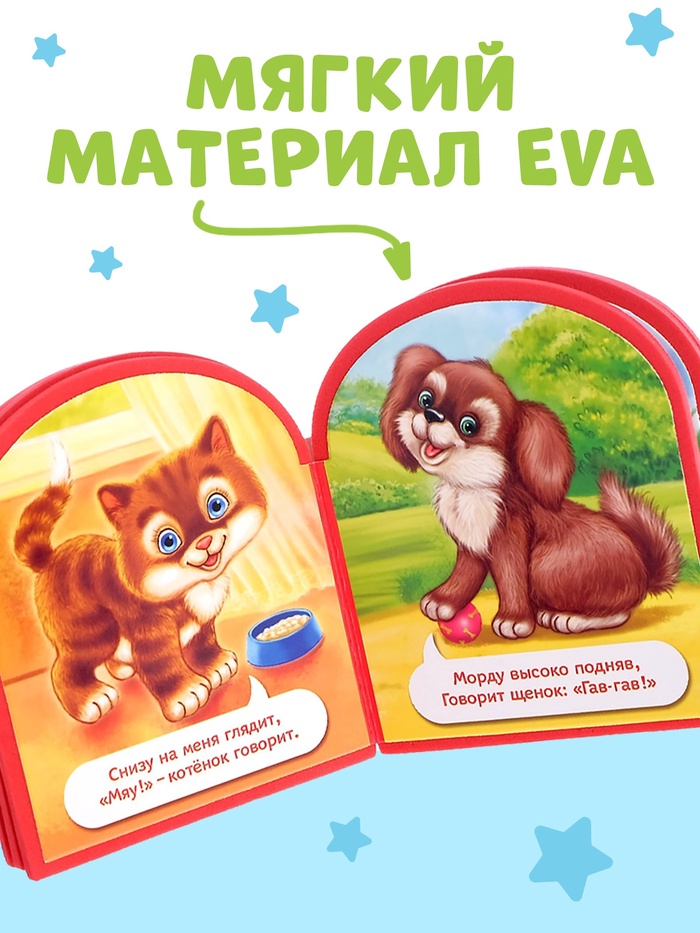 Мягкая книга сделана из приятного на ощупь пористого материала EVA. На каждой странице приклеены яркие иллюстрации с милыми зверятами, которые понравятся малышу.