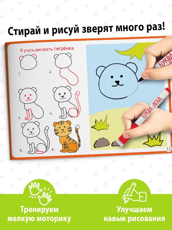 - Многоразовое использование страниц позволяет ребёнку исправлять ошибки, что развивает терпение и внимательность.