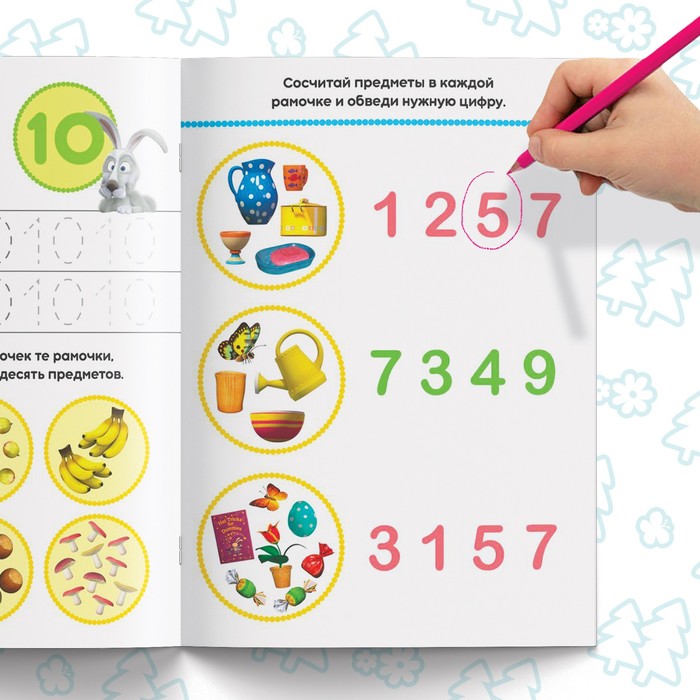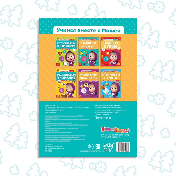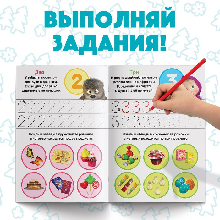 Внутри вы найдёте интересные задания, выполняя которые, малыш выучит цифры до 10. Также в книге есть забавные иллюстрации с любимыми героями мультфильма «Маша и Медведь».