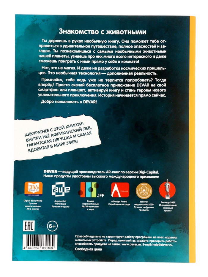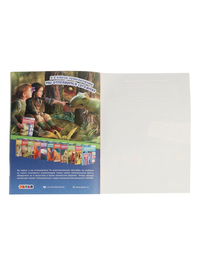 По многочисленным просьбам мы выбрали из наших популярных энциклопедий самые увлекательные факты, объединили их и выпустили в более компактном формате. Теперь каждый сможет завести жирафа и погладить льва! Они оживут в 4D–объёме в дополненной реальности с помощью бесплатного приложения от Devar.