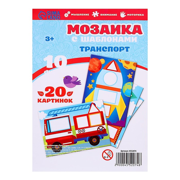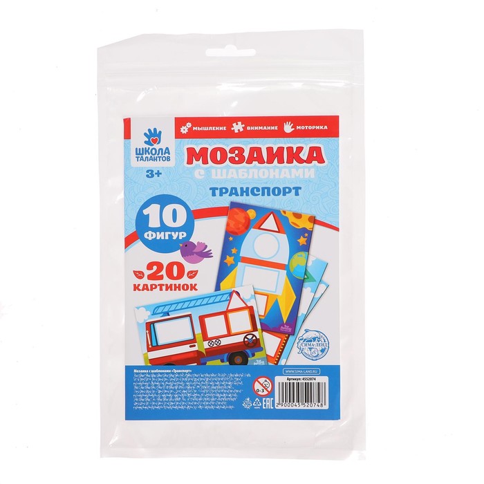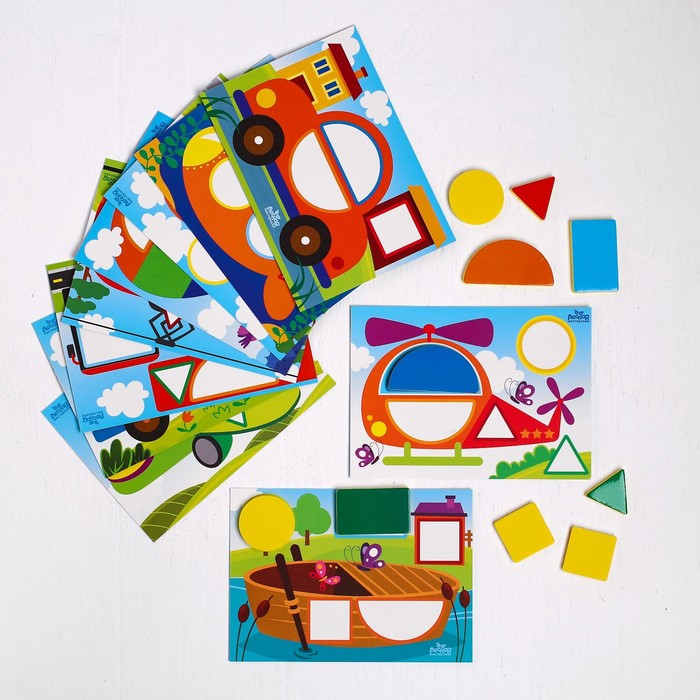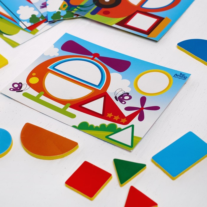 - 10 фигур и 20 картинок: в набор входят готовые шаблоны размером 15×10 см и дополнительные элементы для творчества. Ребёнок может повторять образцы или комбинировать детали.