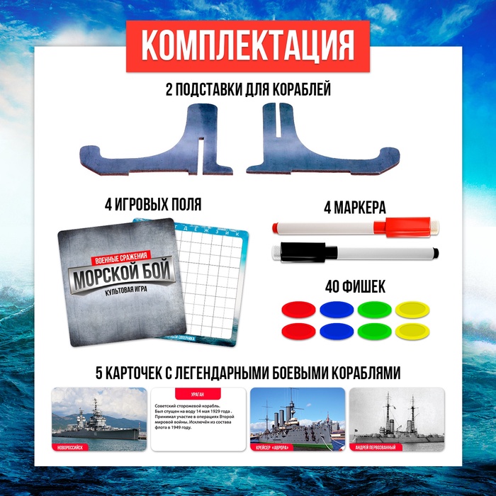 В игре могут участвовать два адмирала возрастом старше 10 лет. Каждый игрок берёт себе одну подставку, две карточки (для личного флота и флота противника) и по два маркера разных цветов. Все жетоны нужно разделить между соперниками поровну. Также в наборе вы найдете карточки с интересными фактами на морскую тематику.