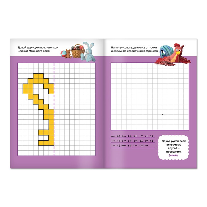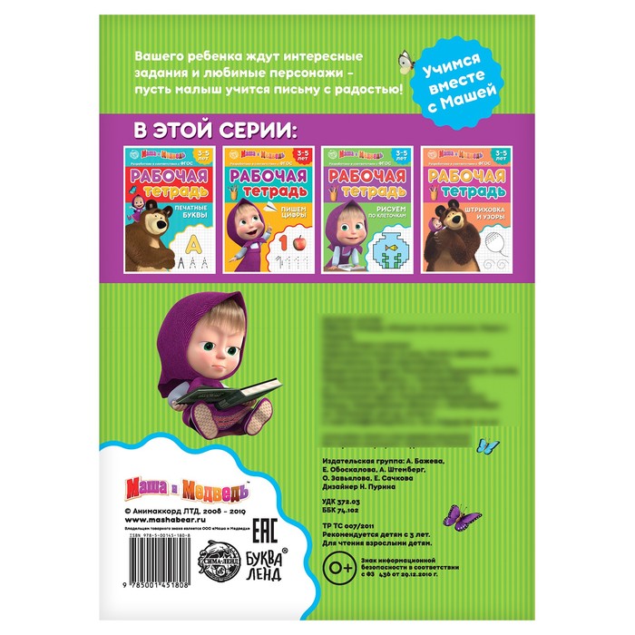 Внутри вы найдёте интересные задания. Выполняя их, малыш выучит буквы и подготовит руку к письму. Также в книге есть забавные иллюстрации с любимыми героями мультфильма «Маша и Медведь».