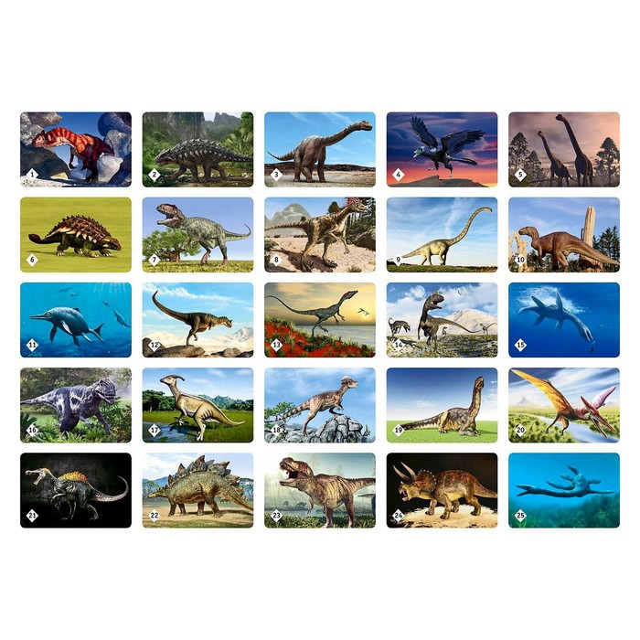 «Мир динозавров» — это разновидность игр мемо. Их особенность в том, что успех зависит не от удачи, а от способностей и стараний игроков. Набор состоит из 50-ти карточек с парным изображением динозавров.