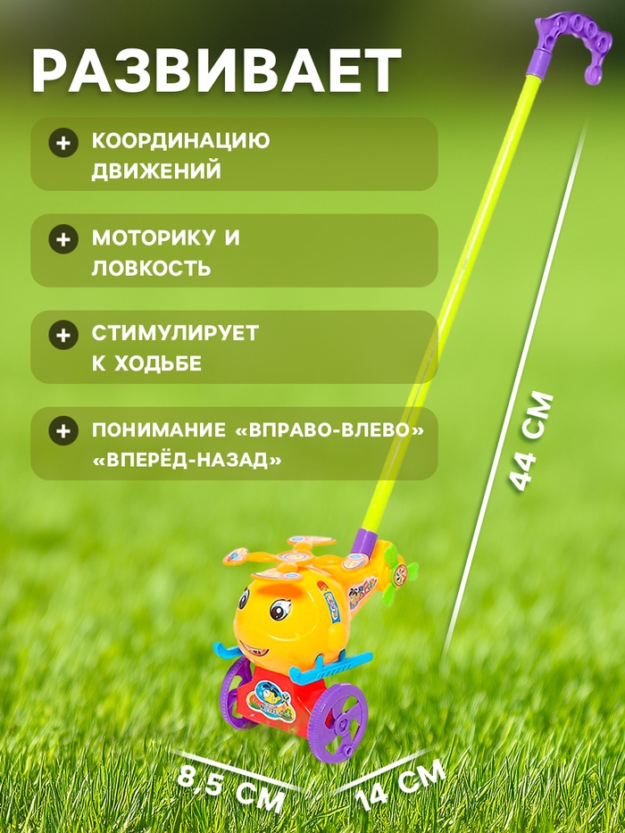 Каталка на палке «Вертолёт», цвета МИКС выполнена из качественных материалов ярких цветов, что, несомненно, привлечет внимание малыша.