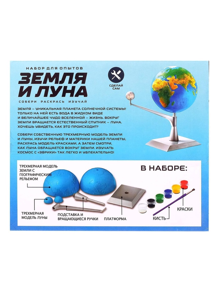 Набор для создания модели Земли и Луны — это увлекательный способ познакомить детей с основами астрономии. С его помощью ребёнок сможет собрать собственную 3D-модель нашей планеты и её спутника, изучая рельеф и материки Земли.