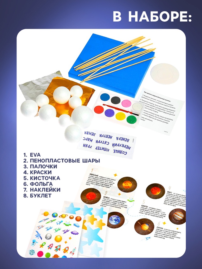 В наборе: пенопластовые шары, палочка, нитки, краски, кисточка, фольга, наклейки, буклет.