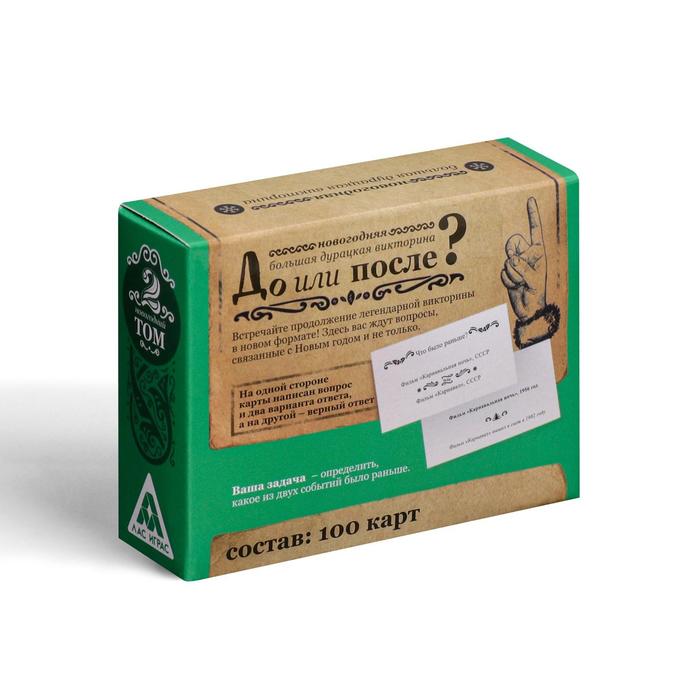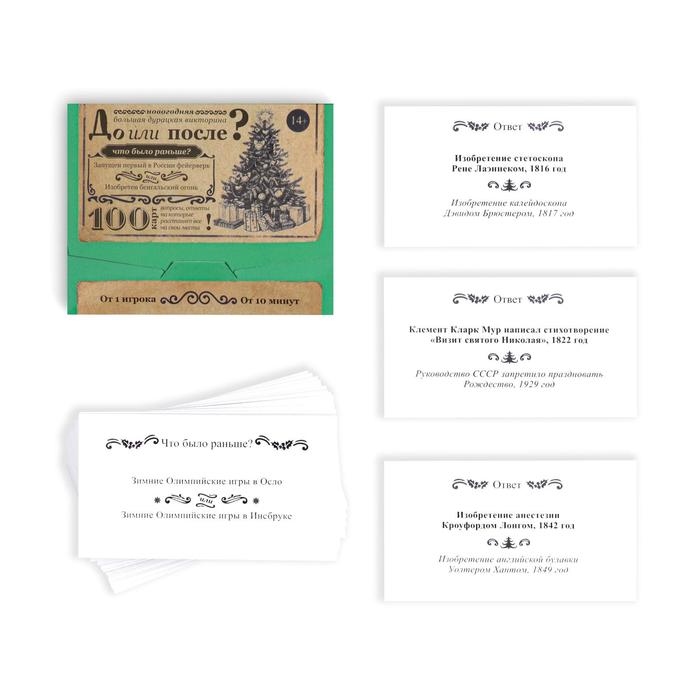 На одной стороне карточки написан вопрос и два варианта ответа. Ваша задача — определить, какое из двух событий было раньше. Чтобы проверить себя или другого участника, просто переверните карту. Там находится ответ и небольшая пояснительная информация.