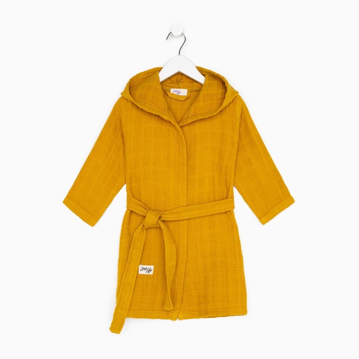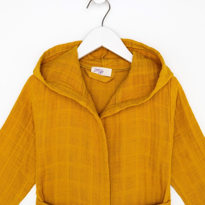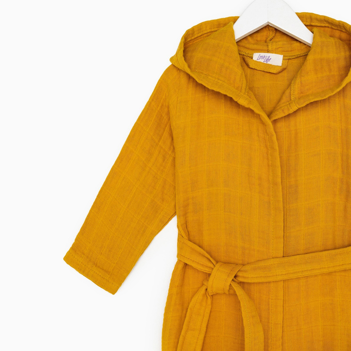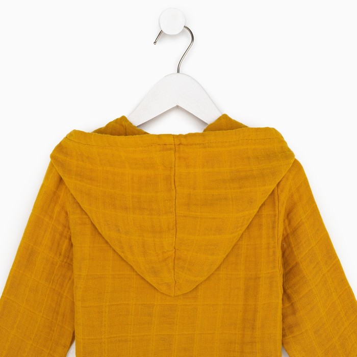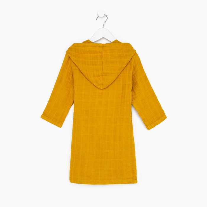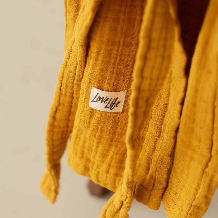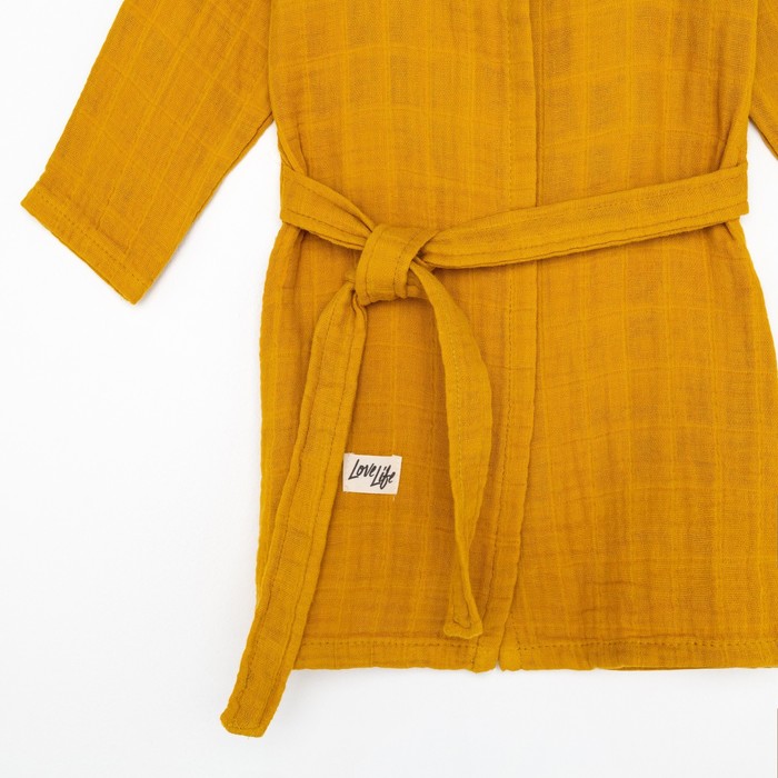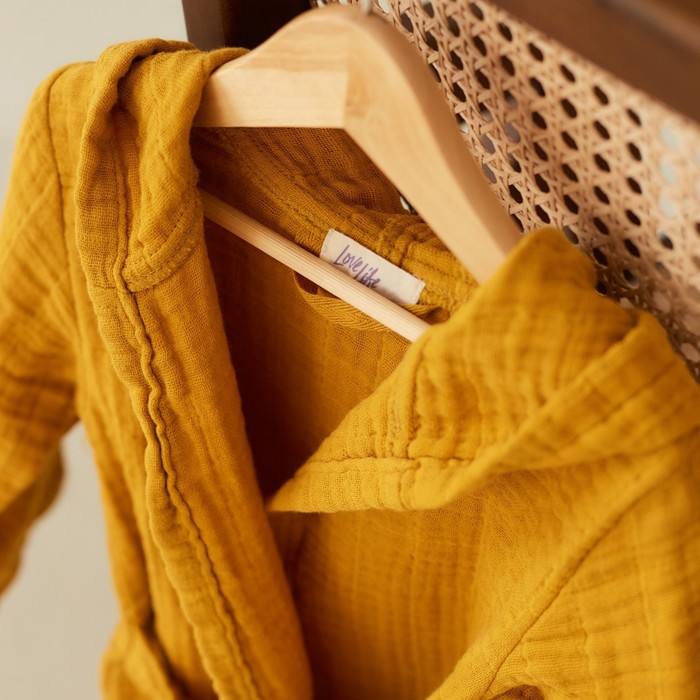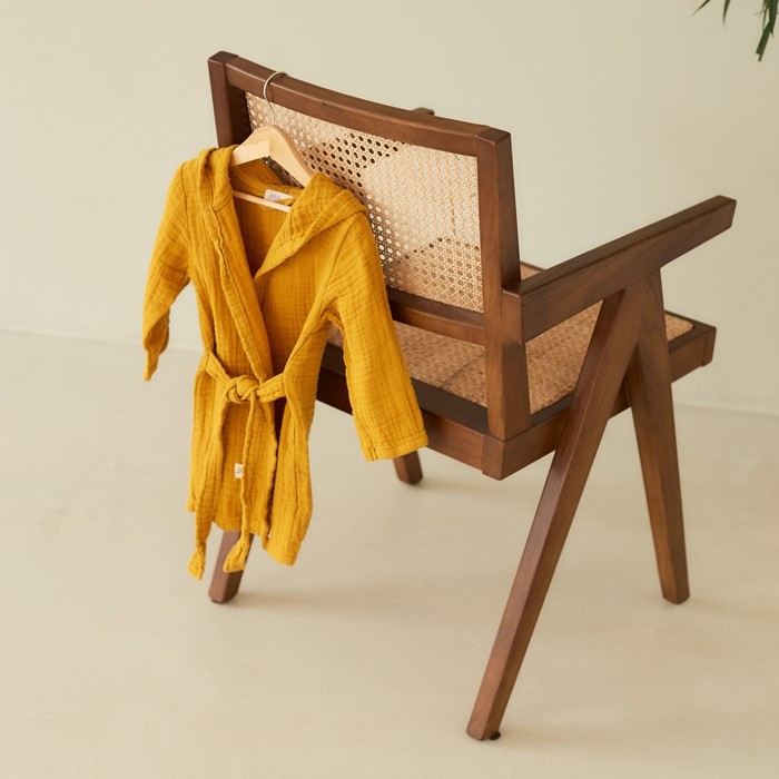 Этот детский муслиновый халат — мягкая и дышащая повседневная вещь для дома. Он создан для детей около трёх лет, которые ценят комфорт и свободу движений. Плотная, но невесомая ткань из натурального хлопка обнимает кожу нежной текстурой, сохраняя её сухой. Горчичный оттенок — тёплый и практичный, он подходит и мальчикам, и девочкам, легко сочетаясь с другой домашней одеждой. Этот халат становится верным спутником после ванны, во время спокойных игр или утренних ритуалов.